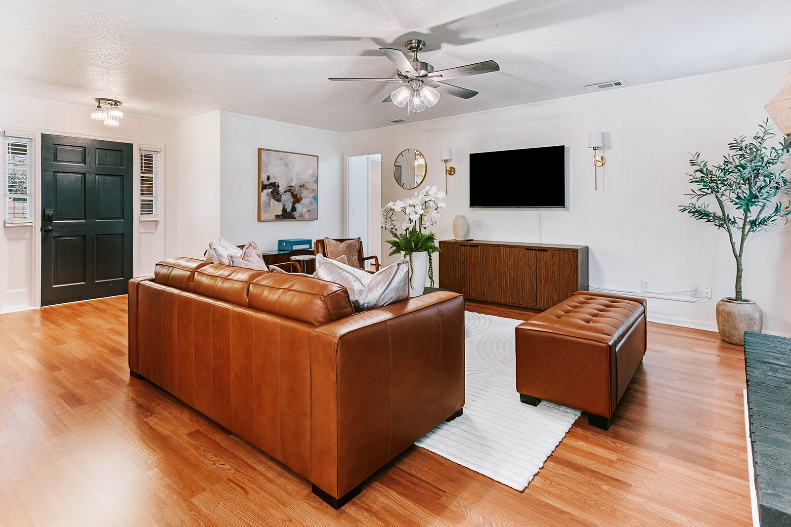 The cozy living room invites you to settle in and make yourself at home. Sink into the comfortable seating and enjoy a movie on the flat-screen TV, or curl up with a good book after a long day of exploring.