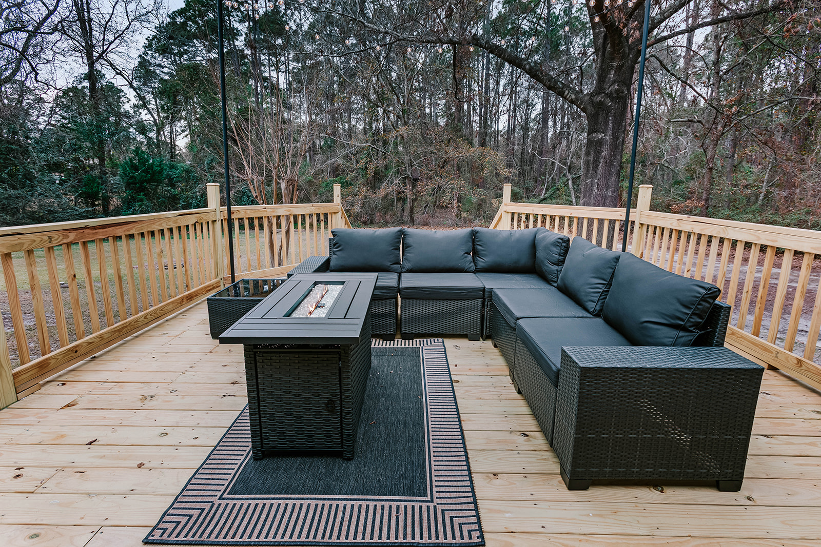 ☀ Spacious backyard + back deck w/ seating, string lights, and gas fire pit